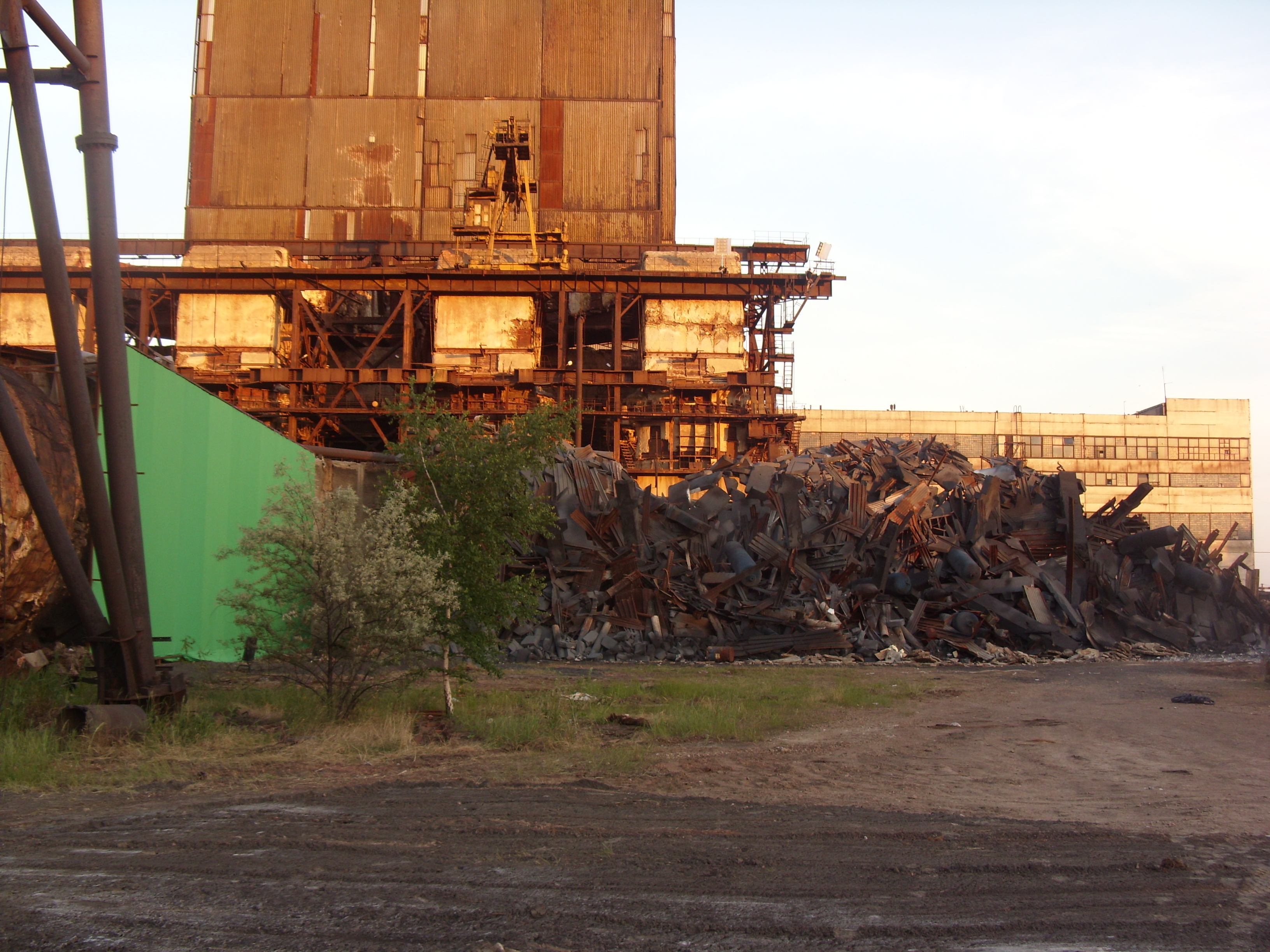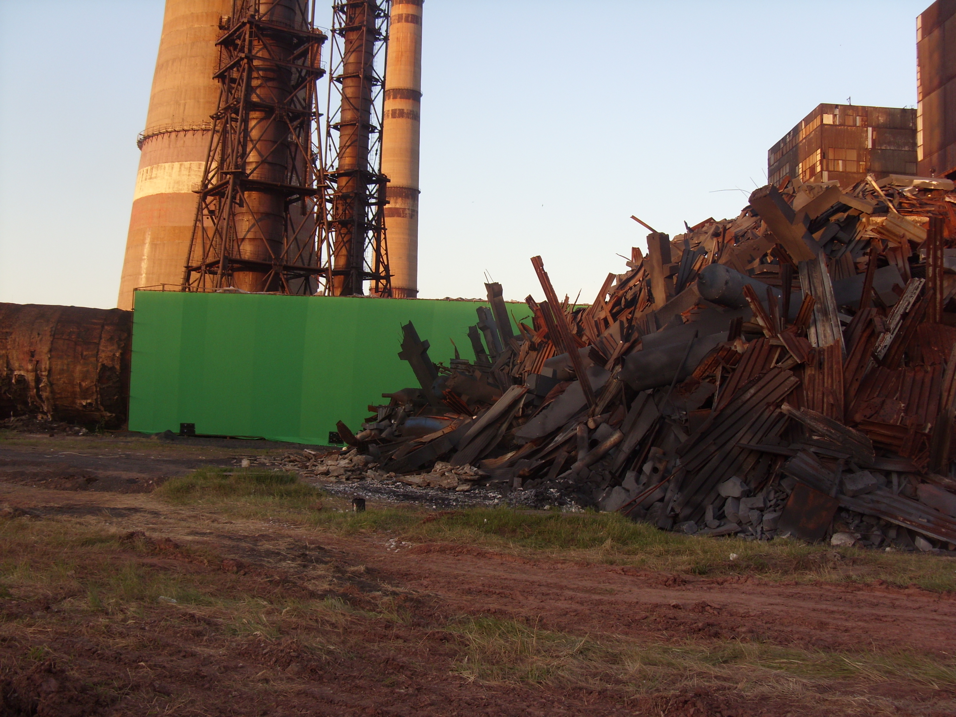 То же с другой стороны. Это вообще-то имитация завала на 4 блоке ЧАЭС. Зеленая стена называется хромокей, на ее фоне компьютерщики графику рисуют. А всякие железки на станцию завезли и потом вывезли.