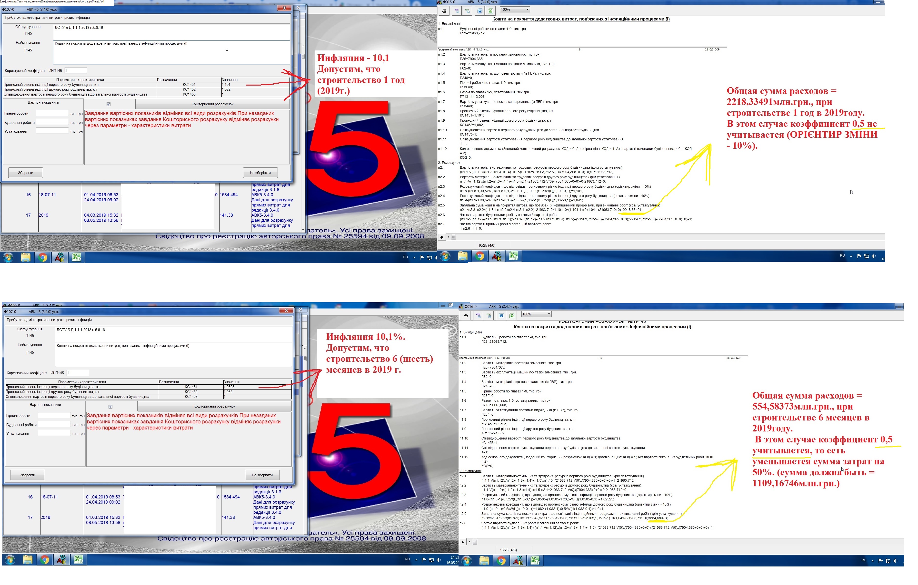 По поводу коєф. 0,5 вы ошибаетесь. Посмотрите внимательно на картинку. В первом случае и во втором коэффициент в расчете (это п.2.3 расчета) присутствуют, но в первом случае он не учитывается (инфляция более 10%), а во втором случае коэф. 0,5 учитывается в расчете (но годовая инфляция на 2019г. также 10%!!! Просто индекс во втором случае меньше, всего 6 месяцев продолжительность). В предыдущих редакциях такого не было.